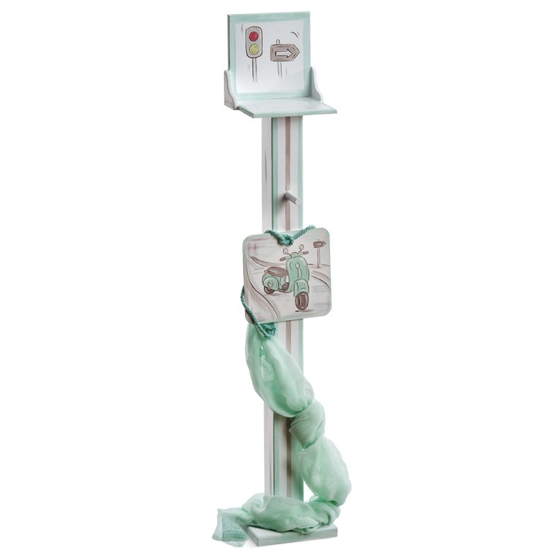 Ξύλινος λευκός κηροστάτης-κρεμάστρα, ζωγραφισμένος στο χέρι σε αποχρώσεις βεραμάν-καφέ-λευκές και στολισμένος με γάζα στο χρώμα της μέντας.Μπροστά είναι διακοσμημένος με ξύλινο ζωγραφιστό καδράκι με βέσπα σε βεραμάν χρώμα,ενώ στο πάνω μέρος του κηροστάτη είναι ζωγραφισμένα φωτεινός σηματοδότης και ταμπέλα για τη ρύθμιση της κυκλοφορίας . Η κολόνα του κηροστάτη είναι ζωγραφισμένη με ρίγα βεραμάν-καφέ-λευκή.