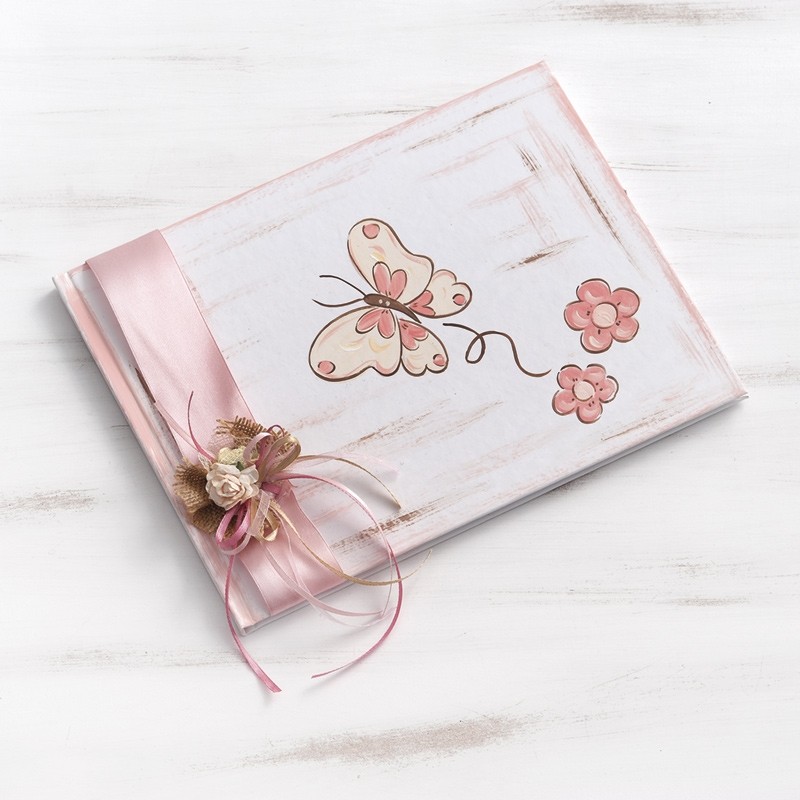 Βιβλίο ευχών λευκό εξωτερικά από χοντρό χαρτόνι, ζωγραφισμένο στο χέρι με πεταλουδίτσα και λουλουδάκια σε ροζ αποχρώσεις και διακοσμημένο με σατέν κορδέλα ροζ και λοιυλουδάκια