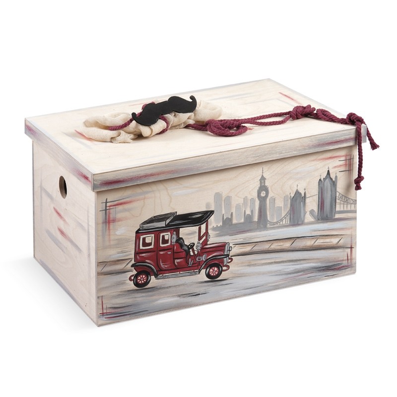 Ξύλινη natural κασέλα, συσκευασία βάπτισης ζωγραφισμένη στο χέρι με θέμα αυτοκίνητο αντίκα κόκκινο να δείχνει πως κάνει τον γύρο του κόσμου. Το καπάκι της κασέλας είναι διακοσμημένο με λινάτσα εκρού, ξύλινο μουστάκι μαύρο και κορδόνι κόκκινο, ενώ όλο το κουτί έχει σβησίματα γκρι-κόκκινα