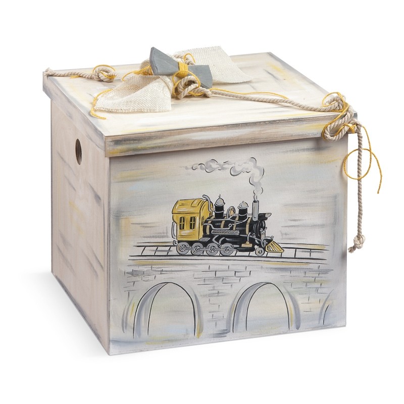 Ξύλινος natural κύβος, συσκευασία βάπτισης ζωγραφισμένη στο χέρι με θέμα τρένο κίτρινο να φαίνεται πως ταξιδεύει περνώντας πάνω από μία γέφυρα. Το καπάκι του κύβου είναι διακοσμημένο με λινάτσα εκρού,ξύλινο παπιγιόν γκρι και κορδόνι εκρού-κίτρινο, ενώ όλο το κουτί έχει σβησίματα γκρι-κίτρινα