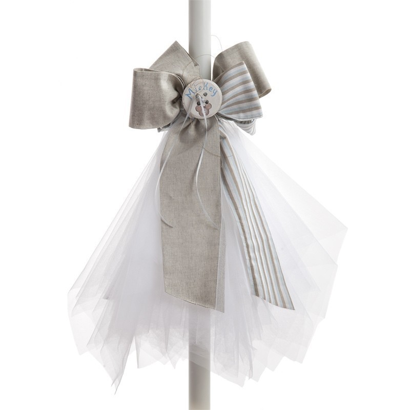 Disney λαμπάδα βάπτισης με τούλι λευκό και δέσιμο με φιόγκο από λινό ύφασμα μονόχρωμο γκρι και ριγέ. Ο φιόγκος είναι διακοσμημένος με ξύλινο κουμπί πάνω στο οποίο είναι ζωγραφισμένο το κεφάλι του mickey αναγράφοντας και το όνομα Mickey