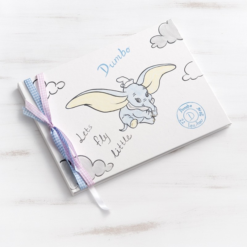Disney βιβλίο ευχών λευκό με εξώφυλλο από χοντρό χαρτόνι, ζωγραφισμένο στο χέρι με το Dumbo το ελεφαντάκι σε ροζ-σιέλ-γκρι αποχρώσεις και ζωγραφισμένη τη φράση Let's fly little Dumbo πάνω