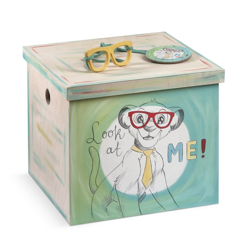 Disney ξύλινος natural κύβος με καπάκι, συσκευασία βάπτισης ζωγραφισμένη στο χέρι σε βεραμάν-κίτρινες αποχρώσεις με τον Lion King ζωγραφισμένο μπροστά να λέει Look at me και με διακοσμημένο καπάκι με μικρό στρογγυλό καδράκι ξύλινο με τον Lion King και με γυαλάκια ξύλινα κίτρινα