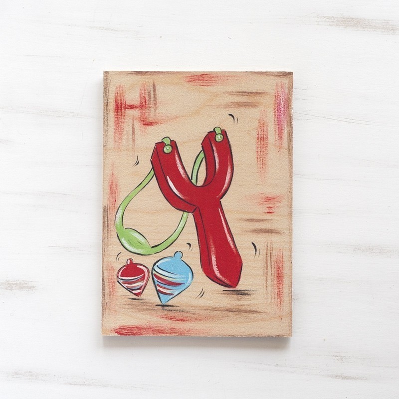 Ξύλινο καδράκι natural παραλληλόγραμμο με σβησίματα κόκκινα-καφέ και με παιδικά παιχνίδια όπως σφεντόνα και σβουρίτσες πολύχρωμες, ιδανικό για διακοσμήσεις και κατασκευές