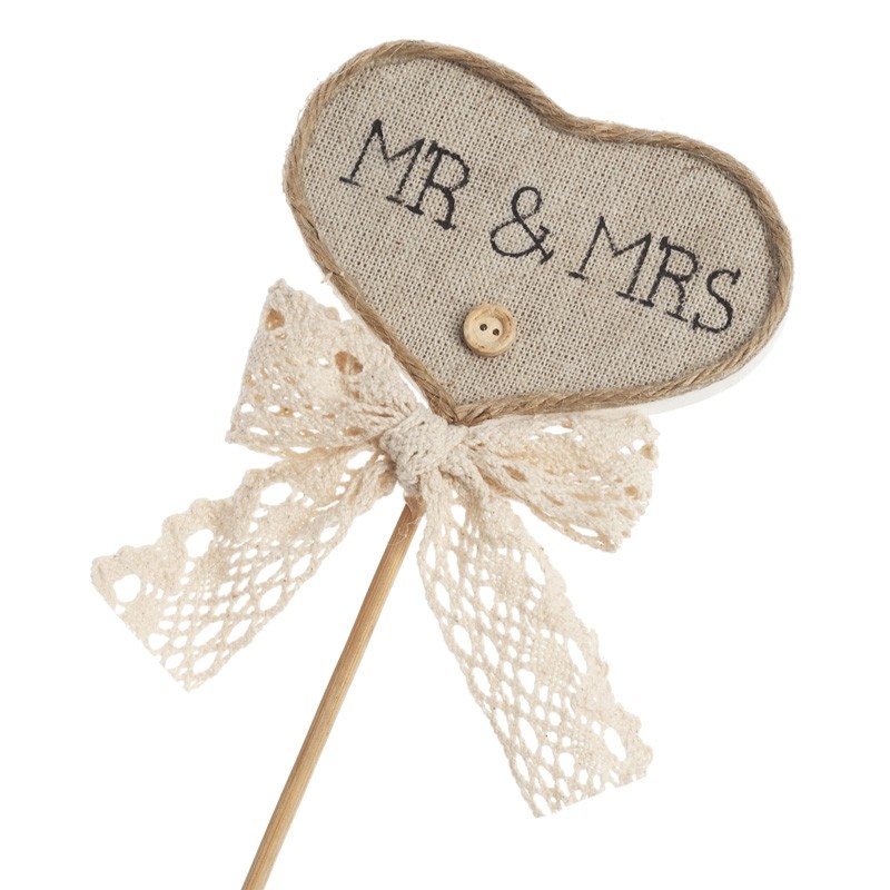 Ξύλινη διακοσμητική καρδιά σε stick και natural χρώμα, στολισμένη με φιόγκο από δαντέλα.Τυπωμένη με λογότυπο Mr & Mrs. Ιδανική και για γάμο.