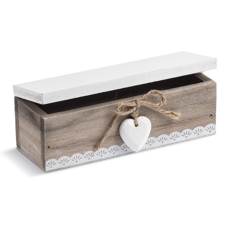 Ξύλινη κασετίνα. Σε natural και λευκή απόχρωση. Διακοσμημένη με κρεμαστή καρδιά, σπάγγο και δαντέλα. Ιδανική και για γάμο.