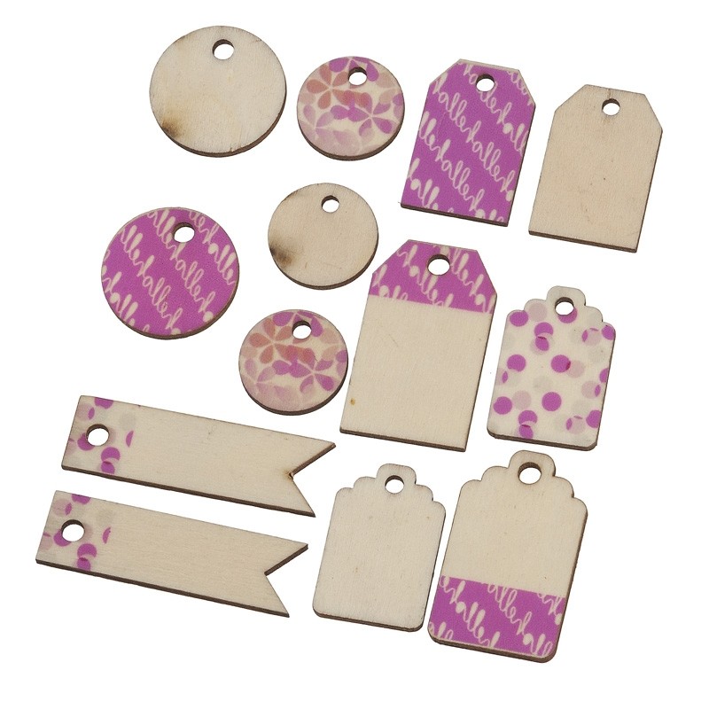 Ξύλινα διακοσμητικά αυτοκόλλητα. Η βάση είναι natural και κυριαρχεί η απόχρωση του ροζ. Ο κωδικός περιέχει 7 διαφορετικά σχέδια. Κάθε καρτέλα έχει 13 τεμάχια.