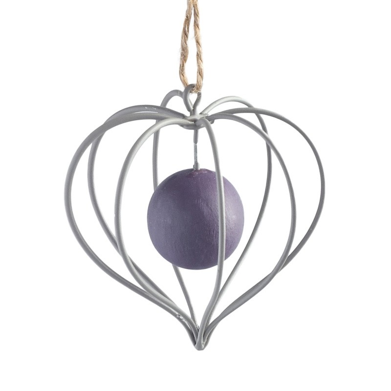 Μεταλλική κρεμαστή διακοσμητική καρδιά σε αποχρώσεις του λιλά με ξύλινη μπάλα στο κέντρο.