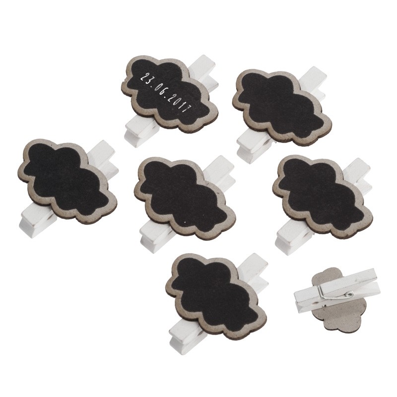 Ξύλινοι μαυροπίνακες με μανταλάκι σε σχήμα συννεφάκι. Η κάθε συσκευασία περιέχει 6 τεμάχια.
