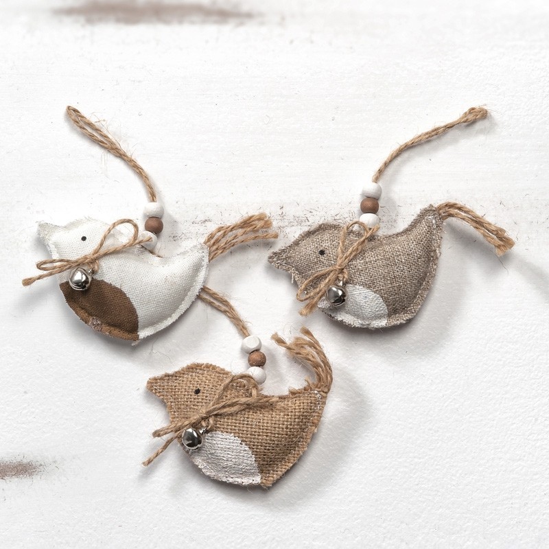 Υφασμάτινα κρεμαστά διακοσμητικά πουλάκια από λινάτσα. Σε 3 διαφορετικούς συνδυασμούς χρωμάτων. Κάθε συσκευασία περιλαμβάνει 3 τεμάχια.