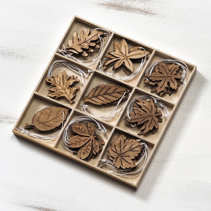 Ξύλινα κρεμαστά διακοσμητικά φύλλα σε natural αποχρώσεις. Αποτελείται από 9 διαφορετικά σχέδια. Κάθε συσκευασία περιέχει 36 τεμάχια.