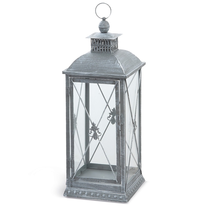 Μεταλλικό φανάρι χιαστί σε γκρι χρώμα με γυάλινο τζάμι. Κατάλληλο για διακόσμηση.