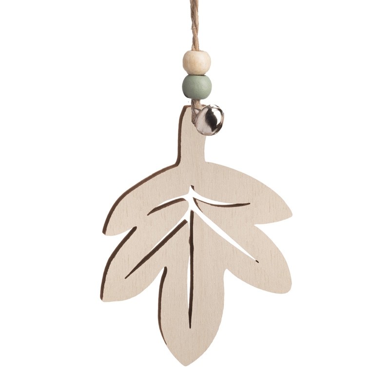 Ξύλινο κρεμαστό πλατύφυλλο σε natural απόχρωση. Στο πάνω μέρος είναι διακοσμημένο με βεραμάν χάντρες, κουδουνάκι και σπάγγο.