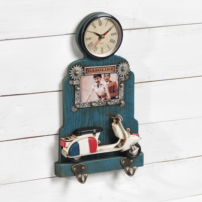 Vintage διακοσμητική μεταλλική αντίκα. Σύνθεση με κορνίζα, κρεμάστρα τοίχου και ρολόι. Συνοδεύεται από βέσπα στο μπροστινό μέρος.