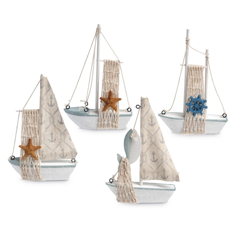 Ναυτικά διακοσμητικά καραβάκια. Η βάση τους είναι πολυεστερική σε λευκή απόχρωση και τα κατάρτια ξύλινα διακοσμημένα με δίχτυ και πανί. Ο κωδικός περιλαμβάνει 4 σχέδια.