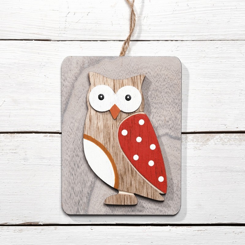 Ξύλινο κρεμαστό διακοσμητικό καδράκι σε natural απόχρωση. Διακοσμημένο με κουκουβάγια σε κόκκινο χρώμα.