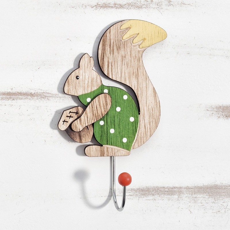 Ξύλινη κρεμάστρα τοίχου. Σκίουρος σε πράσινο πουά χρώμα.