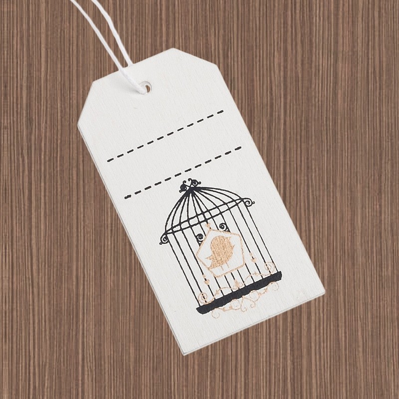 Ξύλινη κρεμαστή ετικέτα σε λευκό χρώμα με γραμμές. Διακοσμημένη με print παράσταση: Πουλάκι σε κλουβάκι.