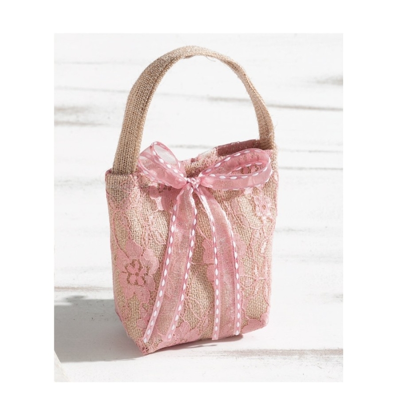 Λινό τσαντάκι καφέ ντυμένο με αντικέ ροζ δαντέλα. Διαφορετικές διαστάσεις κατόπιν συνεννόησης