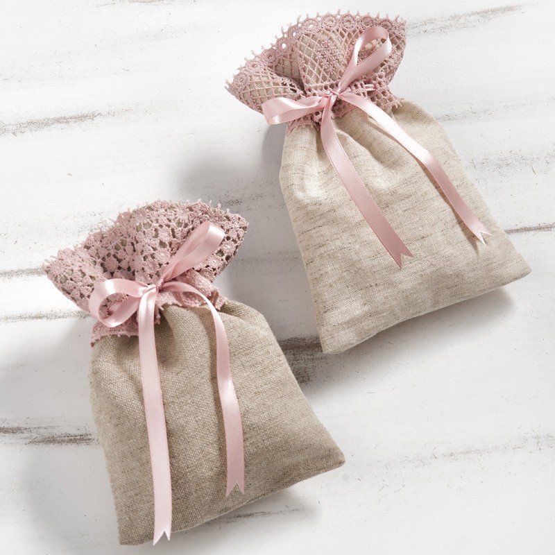 Λινό πουγκί σε ανοιχτή μπεζ απόχρωση με φάσα δαντέλα αντικέ ροζ σε 2 σχέδια. Διαφορετικές διαστάσεις κατόπιν συνεννόησης