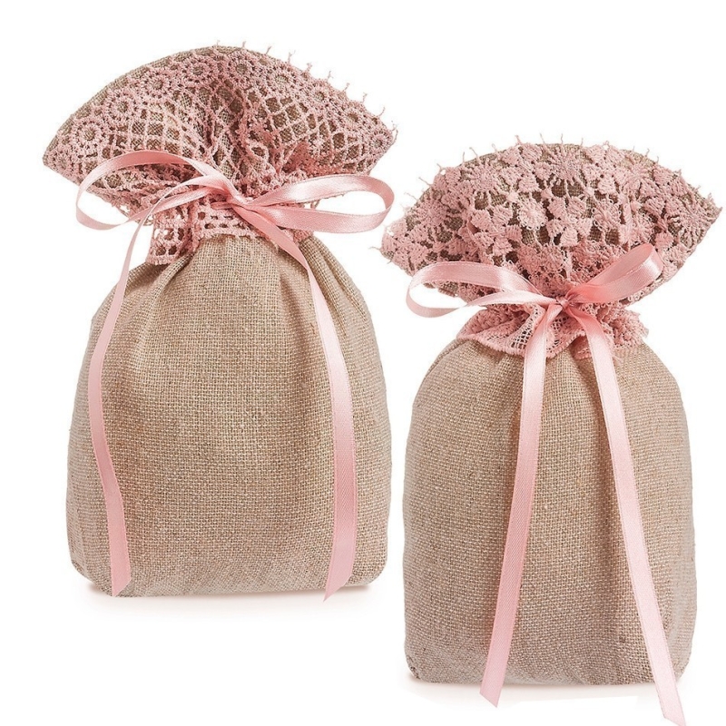 Λινό πουγκί σε καφέ απόχρωση με φάσα δαντέλα αντικέ ροζ σε 2 σχέδια. Διαφορετικές διαστάσεις κατόπιν συνεννόησης