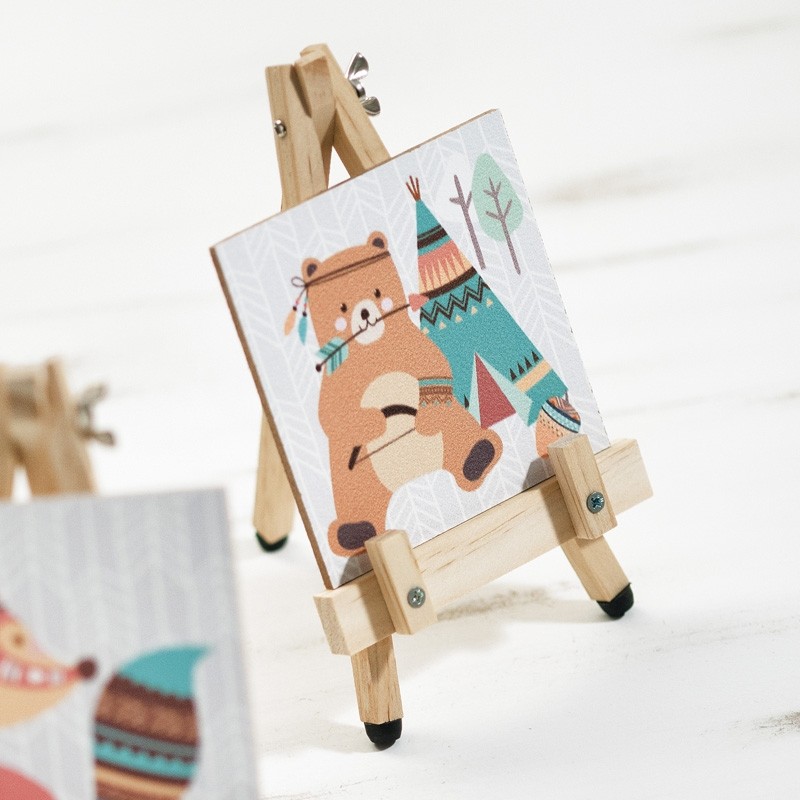 Ξύλινο καδράκι print σε καβαλέτο. Η παράσταση είναι αρκουδάκι σε ethnic χρωματισμούς.