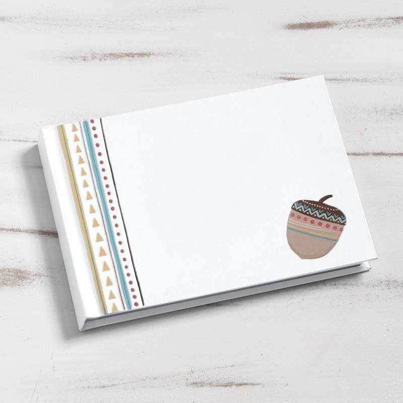 Βιβλίο ευχών λευκό εξωτερικά από χοντρό χαρτόνι, ζωγραφισμένο στο χέρι με βελανίδι και ethnic μοτίβο.