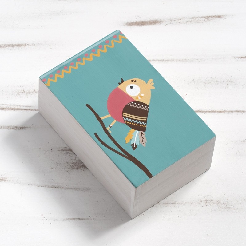 Ξύλινο λευκό κουτί μαρτυρικών, ζωγραφισμένο στο χέρι με ethnic μοτίβο και πουλάκι σε βεραμάν φόντο