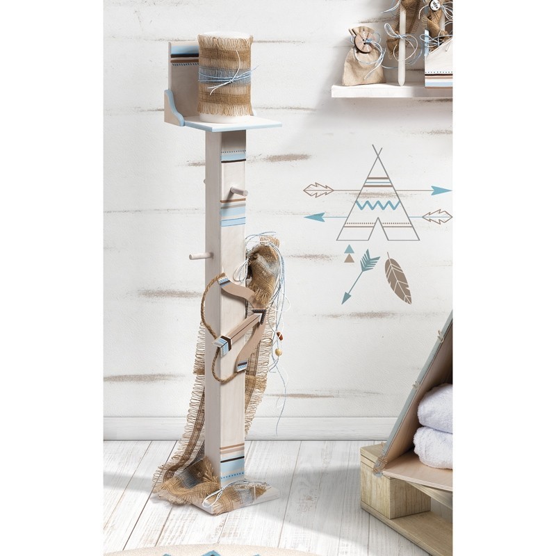 Ξύλινος λευκός κηροστάτης-κρεμάστρα, διακοσμημένος με τσουβάλι σε φυσικές-σιέλ αποχρώσεις,με ξύλινο τόξο σε ethnic στυλ και ζωγραφισμένα ethnic μοτίβα σε χρώματα σιέλ-καφέ.