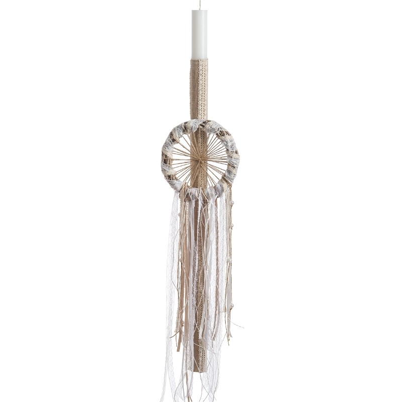 Λαμπάδα βάπτισης δεμένη με λινάτσα εκρού και διακοσμημένη με ξύλινο στεφάνι-ονειροπαγίδα μέσα από το οποίο κρέμονται κορδέλες και δαντέλες σε εκρού-φυσικές-λευκές αποχρώσεις
