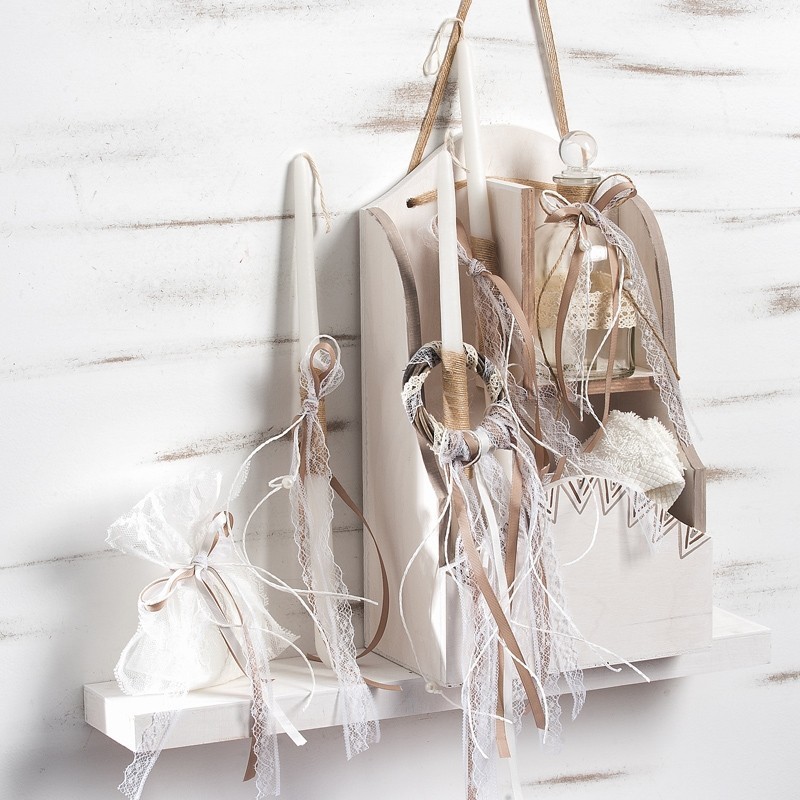 Ξύλινη κρεμαστή συσκευασία, ζωγραφισμένη στο χέρι σε αποχρώσεις φυσικές-λευκές με ξύλινο στεφανάκι-ονειροπαγίδα. Η συσκευασία περιλαμβάνει 3 κεριά, σαπούνι μέσα σε πουγκάκι και μπουκάλι λαδιού, όλα στολισμένα σε φυσικές-λευκές αποχρώσεις