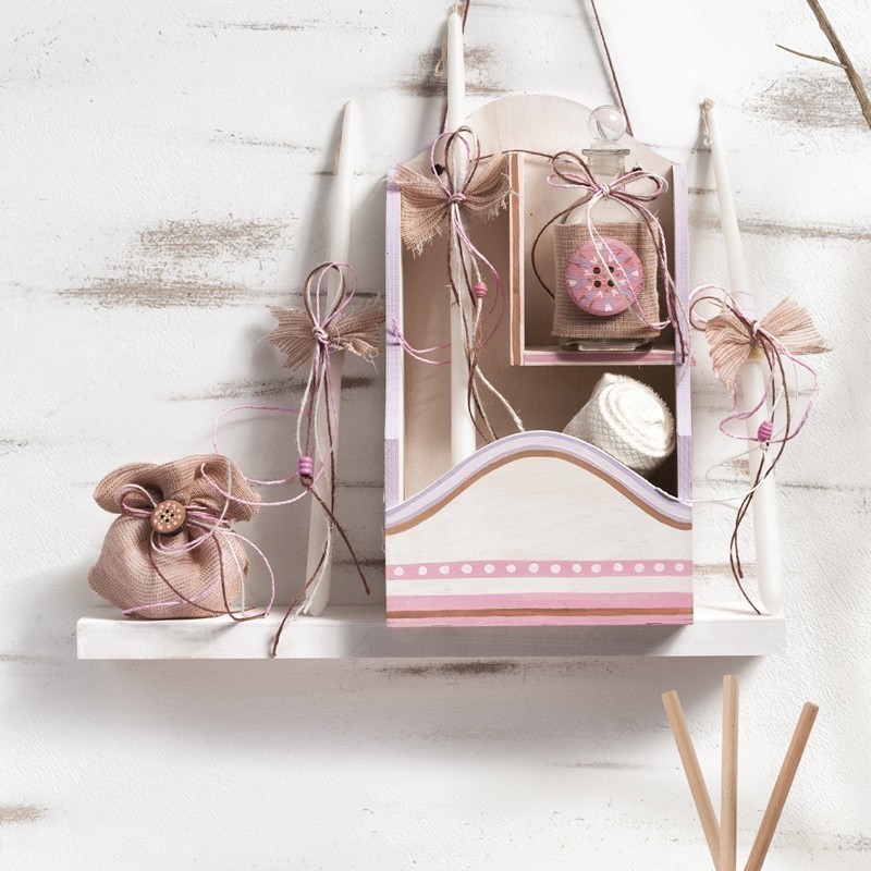 Ξύλινη κρεμαστή συσκευασία, ζωγραφισμένη στο χέρι σε αποχρώσεις λιλά-ροζ-λευκές. Η συσκευασία περιλαμβάνει 3 κεριά, σαπούνι μέσα σε πουγκάκι και μπουκάλι λαδιού, όλα στολισμένα σε ethnic στυλ.
