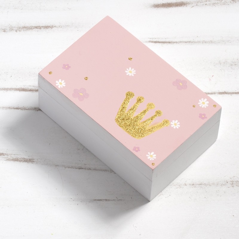 Ξύλινο λευκό κουτί μαρτυρικών με βαμμένο καπάκι ροζ και ζωγραφισμένο στο χέρι με κορώνα χρυσή περιτριγυρισμένη από πολλά μικρά λευκά-ροζ ανθάκια
