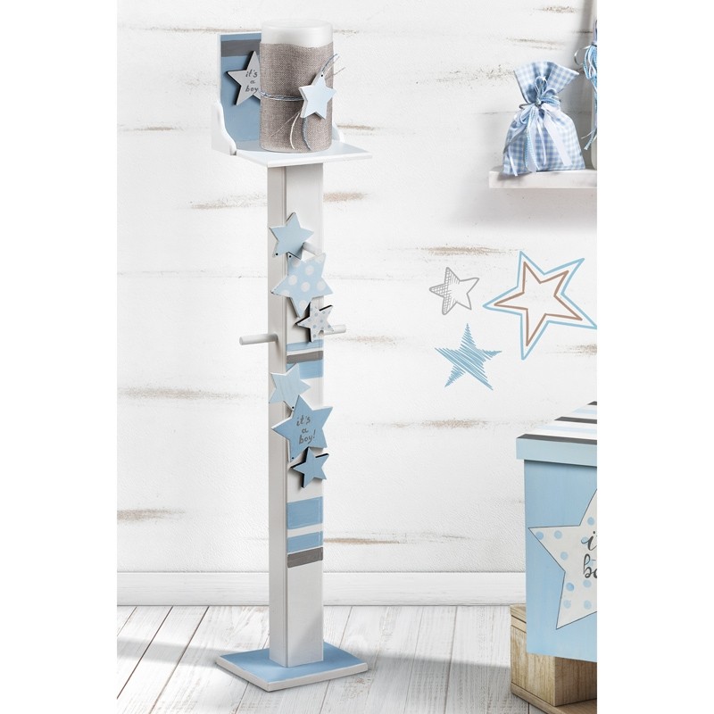 Ξύλινος λευκός κηροστάτης-κρεμάστρα, βαμμένος στο χέρι σε σιέλ-γκρι αποχρώσεις στο μπροστινό τμήμα και στην πλάτη του κηροστάτη και διακοσμημένος με ξύλινα αστέρια σιέλ πουά και μονόχρωμα με δύο από αυτά να γράφουν τη φράση it's a boy πάνω.