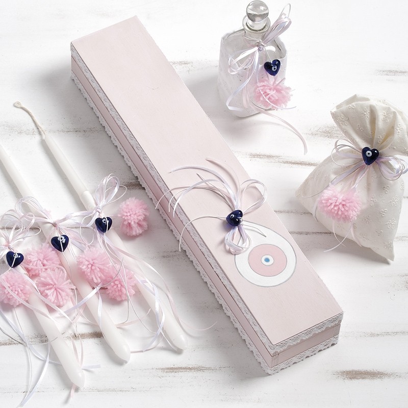 Ξύλινο κουτί συσκευασίας παραλληλόγραμμο βαμμένο ροζ και ζωγραφισμένο στο χέρι με μάτι ροζ για ευτυχία και καλοτυχία και διακοσμημένο με σατέν κορδελίτσες λευκές-ροζ. Ο κωδικός περιλαμβάνει τα 3 κεράκια, το σαπούνι μέσα σε πουγκάκι και το μπουκάλι του λαδιού, όλα στολισμένα σε λευκές-ροζ αποχρώσεις