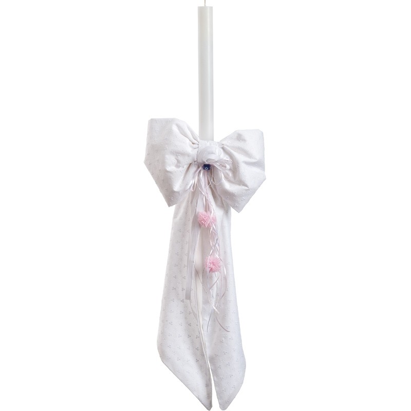 Λαμπάδα βάπτισης, στολισμένη με φιόγκο από ύφασμα embroidery λευκό και διακοσμημένη με ματάκι μπλε,κορδέλες σατέν λευκές-ροζ και ροζ pom-pom