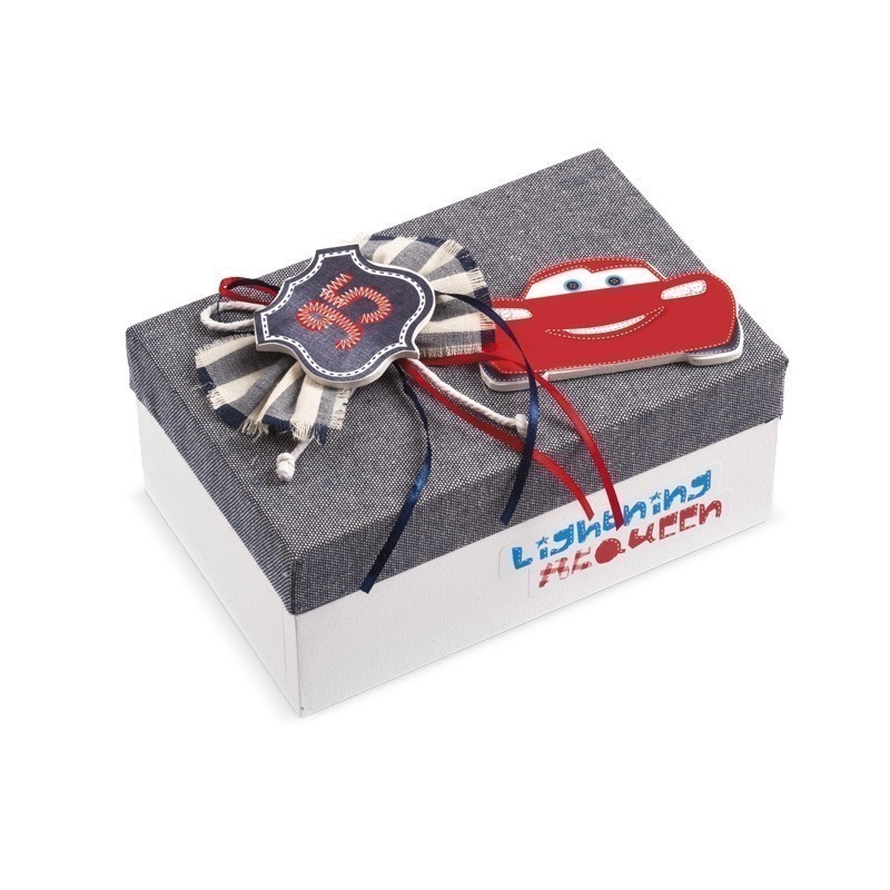 Disney ξύλινο λευκό κουτί μαρτυρικών,ντυμένο με γκρί-μπλε ύφασμα,φιόγκο ριγέ μπλε,κορδελίτσες μπλε-κόκκινες και διακοσμημένο με ξύλινη φιγούρα του Lightning Mcquuen και το ξύλινο σήμα του ασορτί.Στο μπροστινό τμήμα του κουτιού είναι ζωγραφισμένο το όνομα Lightning McQueen