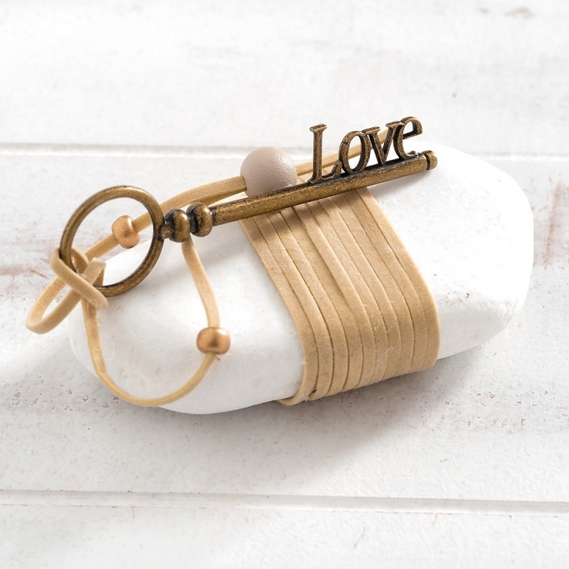 Χειροποίητο διακοσμητικό βότσαλο σε λευκό χρώμα. Είναι στολισμένο με bronze κλειδί με την λέξη love και κορδρόνι suede και χάντρες σε εκρού χρώμα.