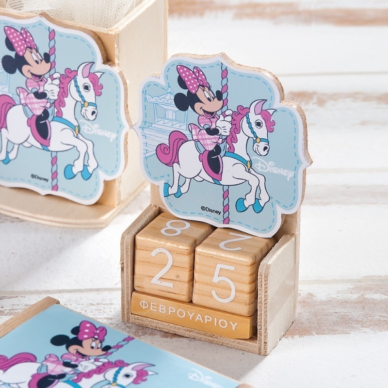 Disney ξύλινο natural ημερολόγιο με δυνατότητα αλλαγής της ημερομηνίας προσαρμόζοντας τα κυβάκια. Είναι διακοσμημένο με ξύλινη παράσταση print Minnie Carousel σε σιέλ-ροζ αποχρώσεις.