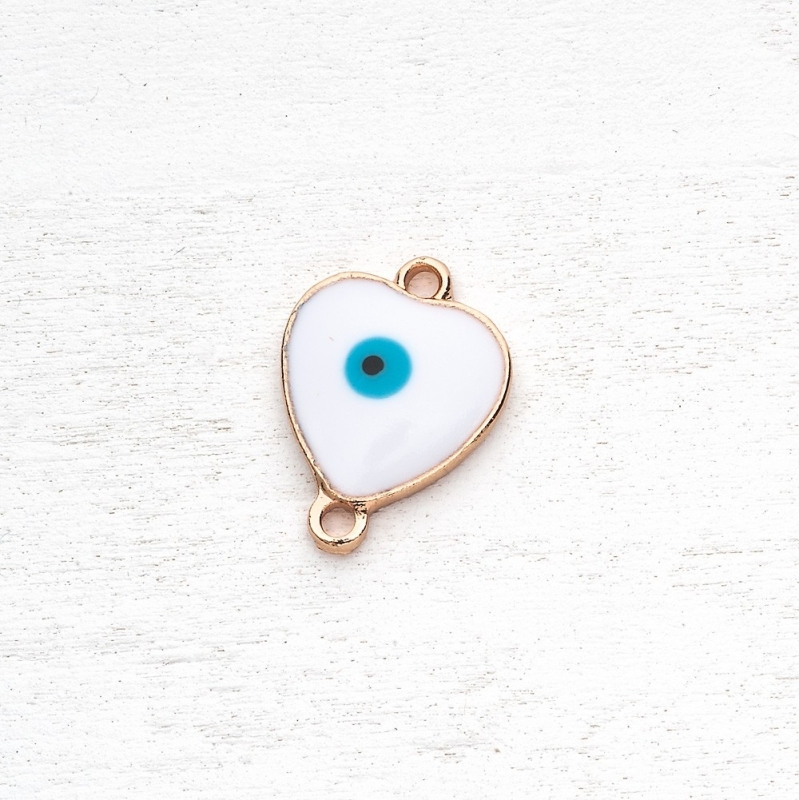 Χρυσό μεταλλικό κρεμαστό ματάκι σε σχήμα καρδιάς με δυο τρύπες σε χρώμα λευκό. Κατάλληλο για διακοσμήσεις και χειροποίητες κατασκευές. Η συσκευασία περιέχει 50 τεμάχια.
