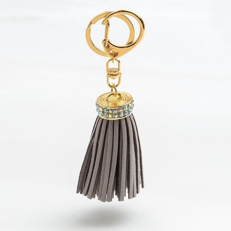 Μεταλλικό κρεμαστό διακοσμητικό χρυσό μπρελόκ με λεπτομέρειες στρας και δερμάτινη φούντα σε χρώμα γκρι. Κατάλληλο για διακοσμήσεις και χειροποίητες κατασκευές.