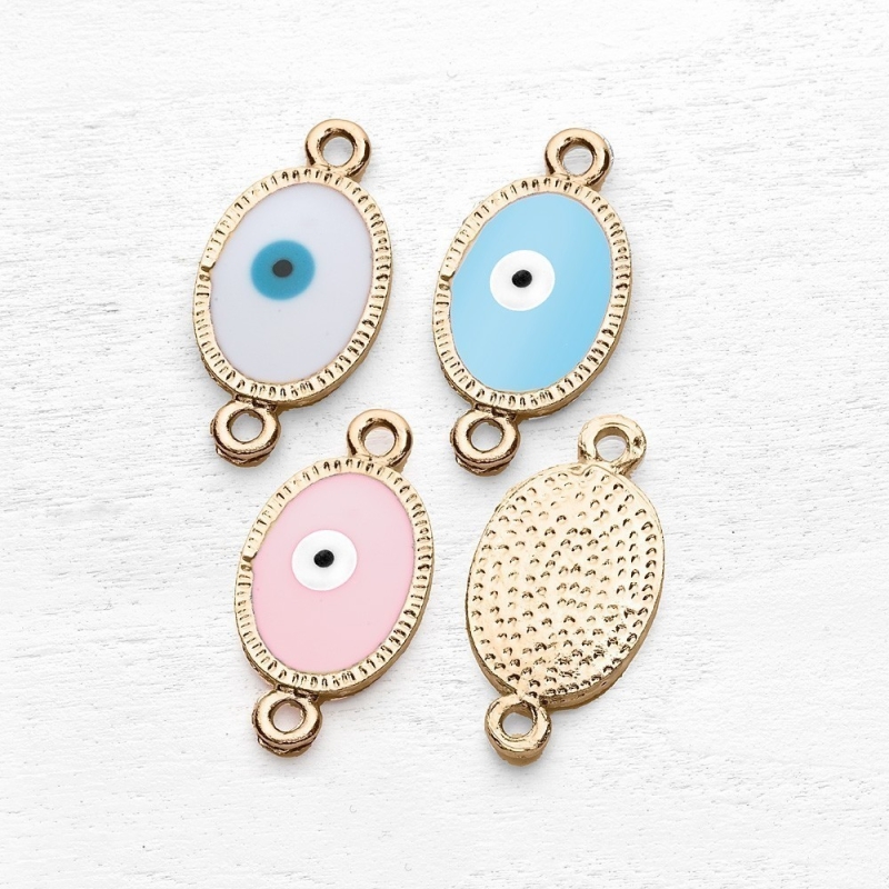 Χρυσό μεταλλικό κρεμαστό οβάλ ματάκι με δυο τρύπες σε χρώμα ροζ Κατάλληλο για διακοσμήσεις και χειροποίητες κατασκευές. Η συσκευασία περιέχει 50 τεμάχια.