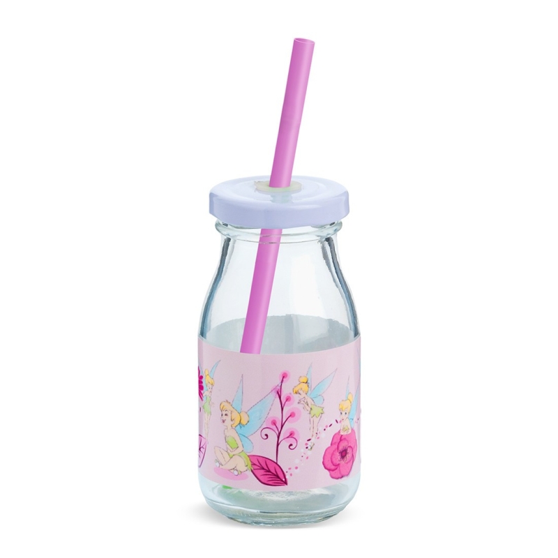 Disney γυάλινο μπουκάλι γάλακτος 200ml με λευκό μεταλλικό καπάκι. Συνοδεύεται από πολύχρωμα καλαμάκια. Είναι διακοσμημένο με αυτοκόλλητο print Tinkerbell flowers σε ροζ αποχρώσεις.
