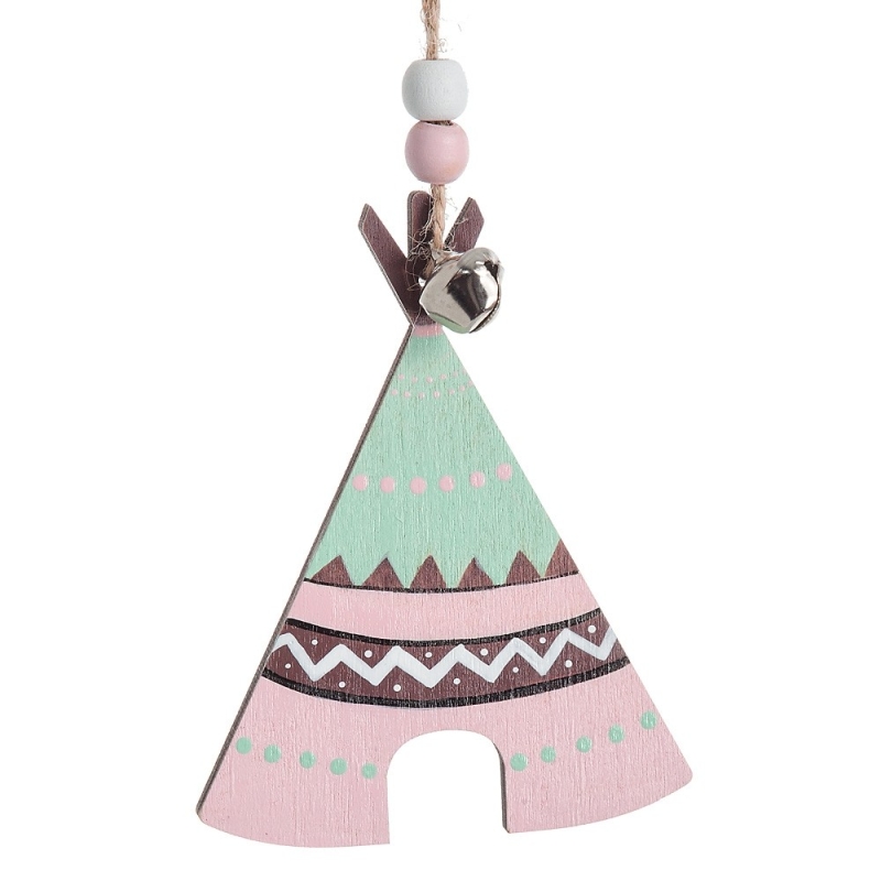 Ξύλινη κρεμαστή ινδιάνικη σκηνή σε χρώμα βεραμάν και ροζ, διακοσμημένη με χάντρες και μεταλλικό κουδουνάκι. Ιδανικό για διακόσμηση.