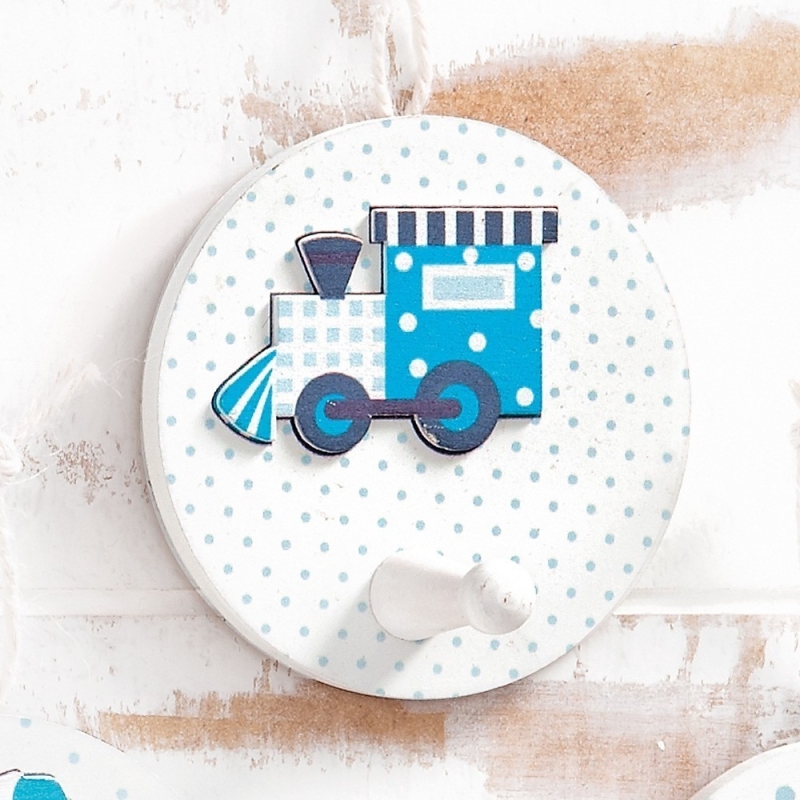 Ξύλινη διακοσμητική στρογγυλή λευκή κρεμάστρα τοίχου. Διακοσμημένη με παράσταση τρένο σε χρώμα σιέλ με φόντο πουά σιέλ και λευκό κρεμαστράκι.