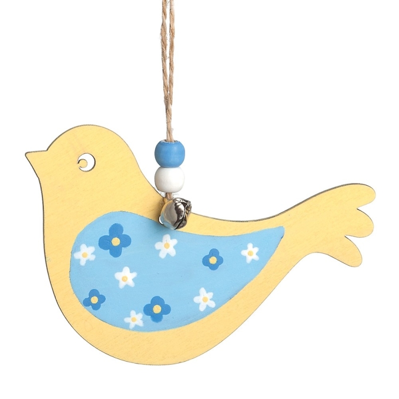 Ξύλινο κρεμαστό πουλί σε κίτρινο χρώμα με σιελ φτερά με λουλουδάκια, διακοσμημένο με χάντρες και μεταλλικό κουδουνάκι. Ιδανικό για διακόσμηση. Στη μια όψη βεραμάν με ρόζ και πίσω μόνο βεραμάν.