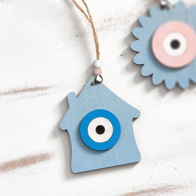 Ξύλινο κρεμαστό σπίτι σε σιελ χρώμα με μπλε στρογγυλό μάτι, διακοσμημένο με χάντρες και μεταλλικό κουδουνάκι. Ιδανικό για διακόσμηση.