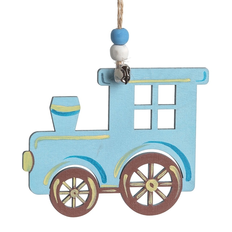 Ξύλινο κρεμαστό τρένο σε σιελ χρώμα με καφέ λεπτομέρειες, διακοσμημένο με χάντρες και μεταλλικό κουδουνάκι. Ιδανικό για διακόσμηση. Στη πίσω όψη μόνο σιελ.
