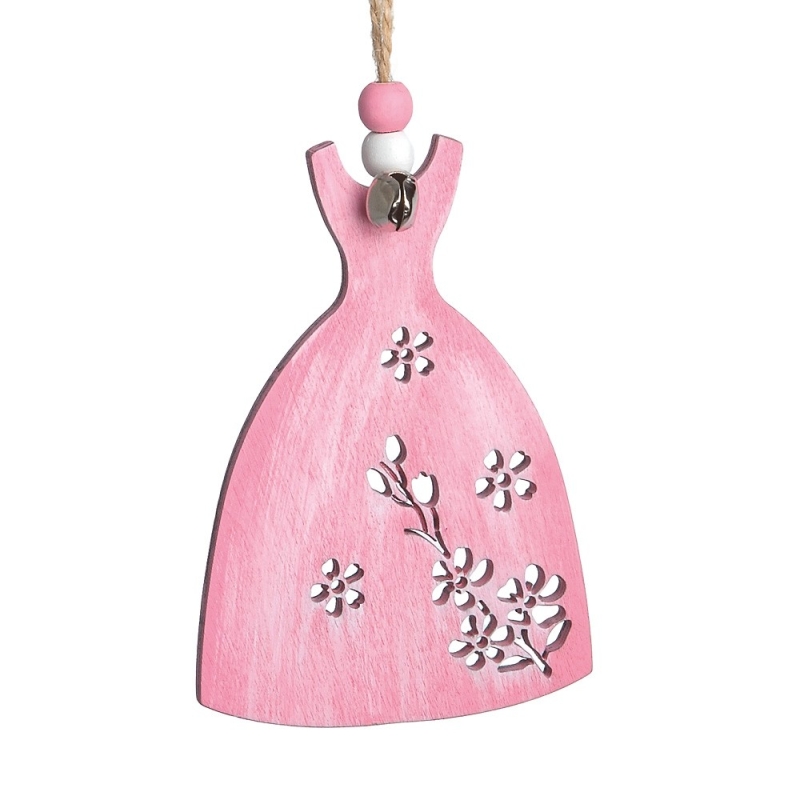 Ξύλινο κρεμαστό φόρεμα σε ροζ χρώμα, διακοσμημένο με χάντρες και μεταλλικό κουδουνάκι. Ιδανικό για διακόσμηση. Στη πίσω όψη μόνο ροζ.