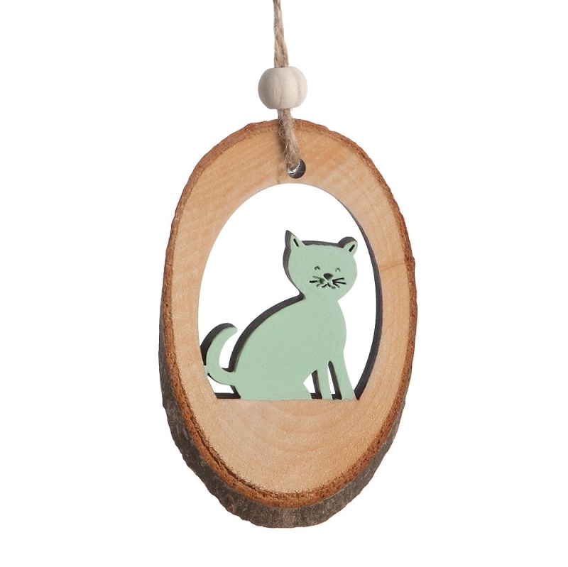 Ξύλινος κρεμαστός διακοσμητικός φυσικός κορμός με βεραμάν γάτα στο εσωτερικό. Διακοσμημένος με ξύλινη χάντρα.